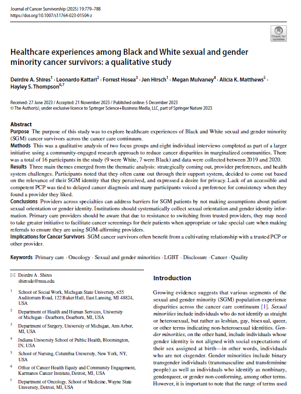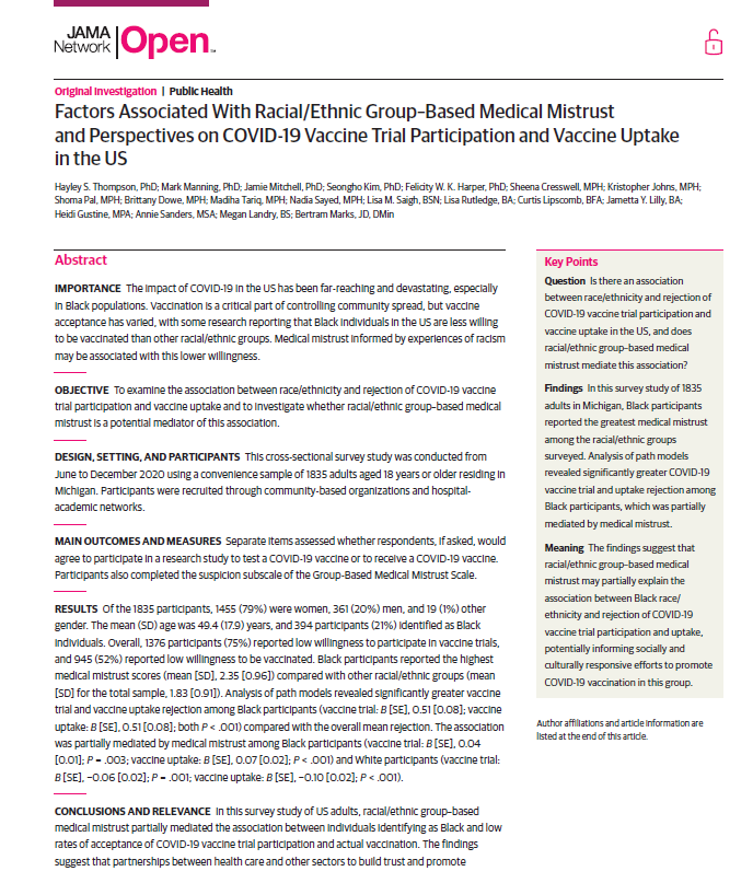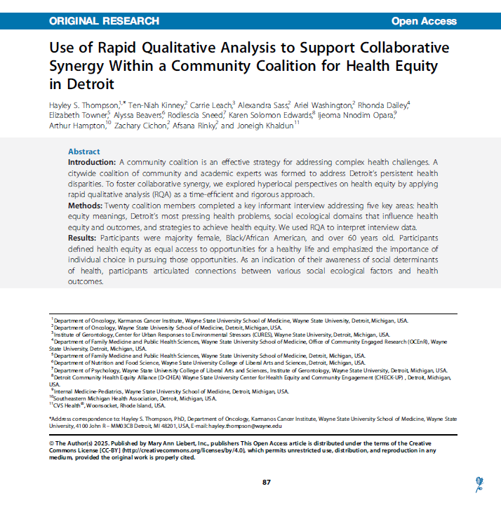 Hayley S. Thompson, PhD, is a professor in the Department of Oncology at Wayne State University School of Medicine. She is the inaugural Associate Center Director for Community Outreach and Engagement (COE) at Karmanos Cancer Institute (KCI), a National Cancer Institute (NCI)-Designated Comprehensive Cancer Center. She is also founding director of WSU’s Community-Engaged Collaborative for the Promotion of Access to Technology and Health (CEC-PATH). Dr. Thompson is a clinical psychologist whose research addresses racial and ethnic disparities in cancer care and outcomes, including cancer survivorship. Notably, she is developer of the Group-Based Medical Mistrust Scale (GBMMS). Dr. Thompson has received past funding from NCI, Agency for Healthcare Quality and Research (AHRQ), American Cancer Society (ACS), and the Patient-Centered Outcomes Research Institute (PCORI), as well as multiple foundations.